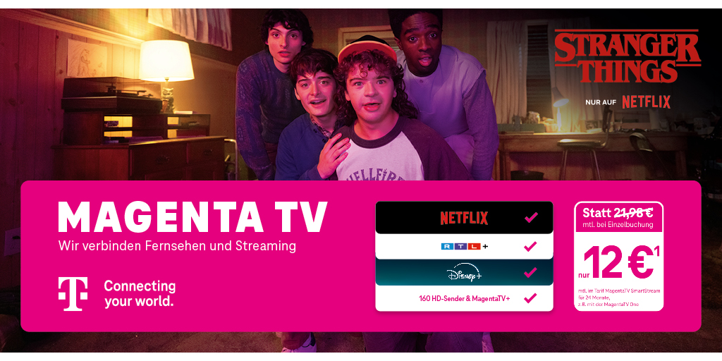 1) Aktion gilt bis 02.02.2026 für MagentaTV Neukunden. MagentaTV SmartStream kostet in den ersten 6 Monaten 0 €/Monat, vom 7.–24. Monat 12 €/Monat und danach 17 €/Monat. Mindestvertragslaufzeit 24 Monate. MagentaTV ist über die MagentaTV App ohne zusätzliche Hardware empfangbar. Auf Wunsch kann die TV-Box MagentaTV One für 5 €/Monat, zzgl. 6,95 € Versandkosten, mit einer Mindestvertragslaufzeit von 12 Monaten gemietet werden. Alle Preise inkl. der gesetzlichen MwSt. MagentaTV SmartStream enthält RTL+ Premium, Netflix Standard mit Werbung und Disney+ Standard mit Werbung (jeweils HD verfügbar). Voraussetzung für die Nutzung von Netflix und Disney+ sind die Registrierung und Akzeptanz der Nutzungsbedingungen und Datenschutzbestimmungen bei Netflix International B.V. und Disney+. Voraussetzung für die Nutzung ist eine bestehende Internetverbindung. Für die Internetverbindung gelten die Bedingungen des jeweiligen Internetanbieters. Bei Nutzung über das Mobilfunk-Datennetz erfolgt die Belastung des Datenvolumens beim jeweiligen Mobilfunk-Anbieter.