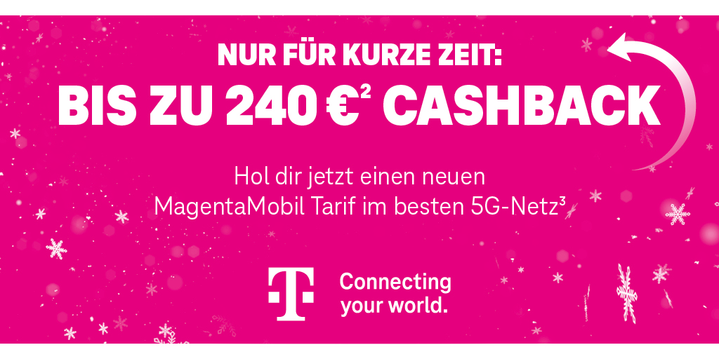 2) Im Aktionszeitraum 05.12.2025 bis einschließlich 02.02.2026 erhalten Kunden bei Abschluss eines neuen Mobilfunk-Vertrags mit einer Mindestvertragslaufzeit von 24 Monaten in den Tarifen MagentaMobil XS und S mit oder ohne Endgerät einen Cashback in Höhe von 120 € sowie in den Tarifen MagentaMobil M, L und XL mit oder ohne Endgerät einen Cashback in Höhe von 240 € gutgeschrieben (ausgeschlossen sind PlusKarten Tarife inkl. PlusKarte+, PlusKarte Kids & Teens und PlusKarte Data, Young Tarife, Special Tarife, DTAG-Tarife, for Friends Tarife und Datentarife). Z. B. MagentaMobil S für 39,95 €/Monat, einmaliger Bereitstellungspreis 39,95 €. Die Gutschrift ist nicht mit weiteren Aktionspromotions wie z. B. 6 Monate Grundpreisbefreiung kombinierbar. Zum Erhalt der Gutschrift (nach Ablauf der Widerrufsfrist) ist vom 01.01.–31.07.2026 eine Online-Registrierung über die MeinMagenta App (mit Klick auf Ihr Profil, „Cashback einlösen“) unter Vorlage der ersten Rechnung entsprechend den genannten Bedingungen erforderlich.